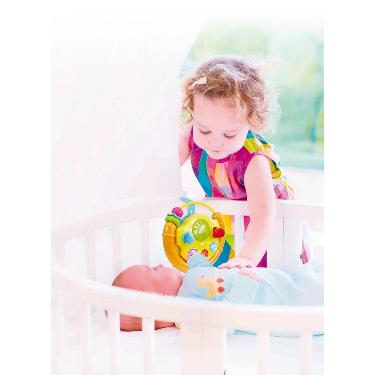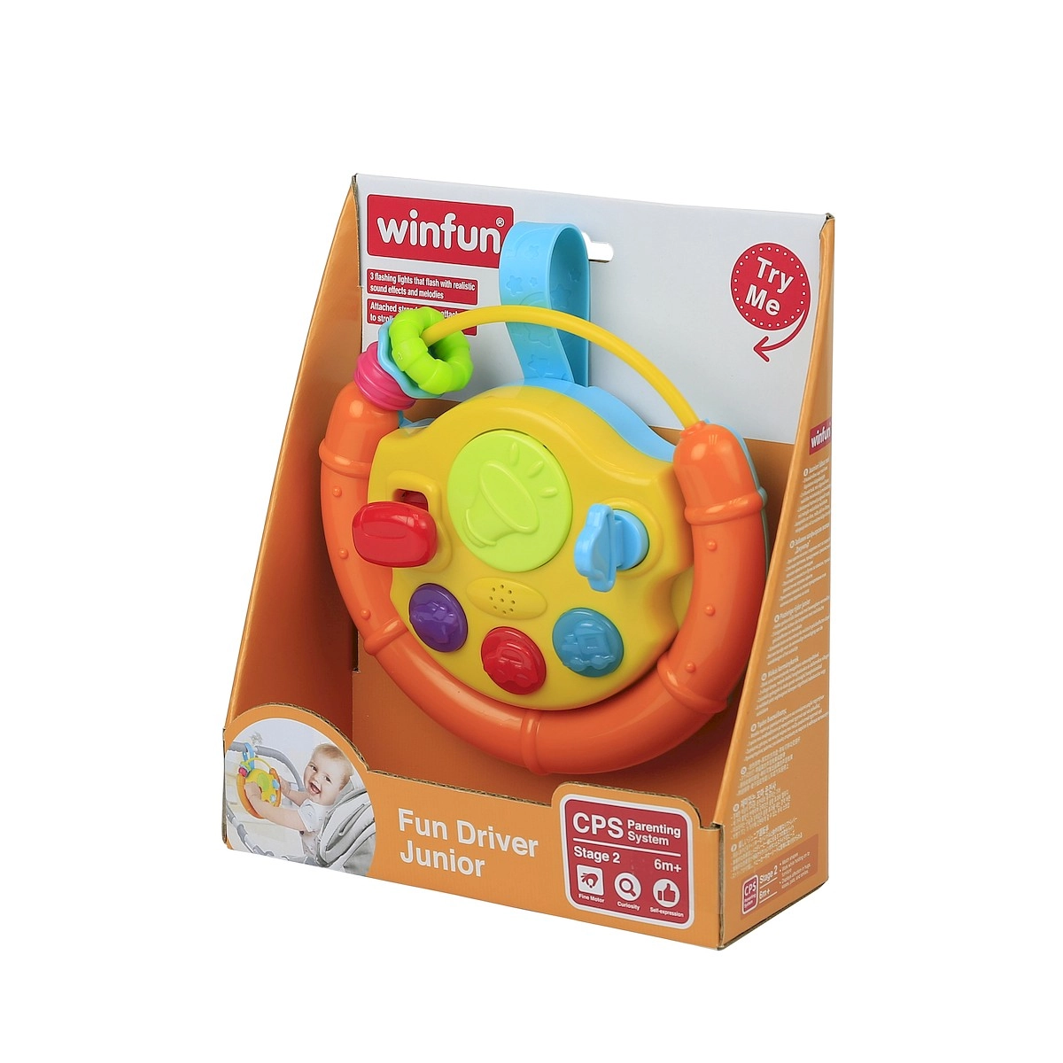 Datorită curelei practice, jucăria se fixează ușor pe pătuț, scaunul auto sau cărucior. Contactul de pornire rotativ cu cheiță, butoanele funcționale și elementele rotative prelungesc timpul de joacă și ajută la dezvoltarea auzului, văzului și a abilităților motorii.