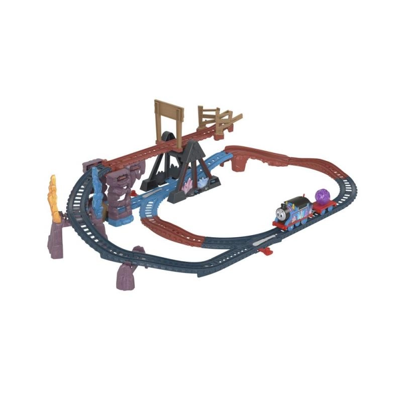 Porniți cu Thomas într-o aventură cristalină! Acest set de cale ferată plin de acțiune oferă un traseu pe mai multe niveluri cu pod basculant, intersecție și elemente tematice „cristal”. Printr-o singură comutare pe acoperișul locomotivei Thomas, ea pornește pe șine și livrează încărcătura în peșteră.