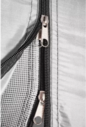 Cortul este echipat cu un acoperiș practic, care protejează lucrurile tale de ploaie. Plasa anti-țânțari asigură protecție împotriva insectelor și trecerea liberă a aerului. Ventilarea corectă este susținută de un ventil de vârf cu plasă anti-țânțari, care poate fi protejat împotriva ploii.