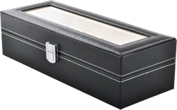 Modelul are un design negru stilat cu cusături contrastante, oferind întregii cutii un aer de eleganță și lux. Capacitatea de sticlă asigură nu doar protecția ceasurilor, ci și o expunere efectivă a acestora.