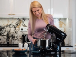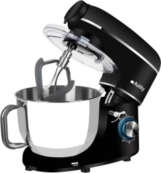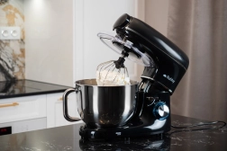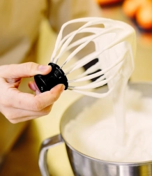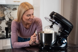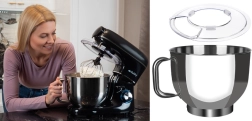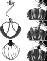 În pachet găsiți trei accesorii: cârlig pentru aluat, tel balon și paletă de amestecare cu raclete din silicon pentru îmbinare perfectă a ingredientelor. Baza stabilă cu ventuze antiderapante, blocare de siguranță și rotiță de control iluminată cu LED fac din robot un partener de încredere pentru coacere și gătitul zilnic.