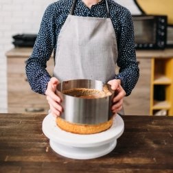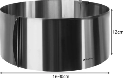 Inelul rotund reglabil pentru tort este ideal pentru coacerea blaturilor, asamblarea și răcirea torturilor și deserturilor. Nu are bază, astfel că aluatul se toarnă pe o tavă tapetată cu hârtie de copt și se setează ușor diametrul dorit. Scala internă 16–30 cm din 2 în 2 cm economisește timp și asigură precizie.