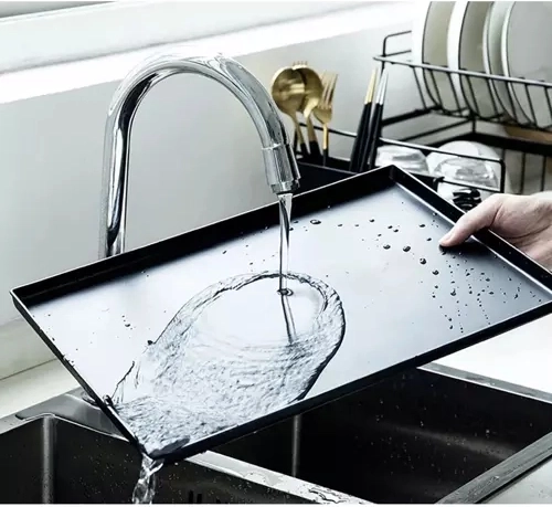 Tava din plastic neted reține apa care se scurge și menține suprafața de lucru uscată. După folosire, o clătești simplu sub jet de apă – întreținerea durează doar câteva clipe.