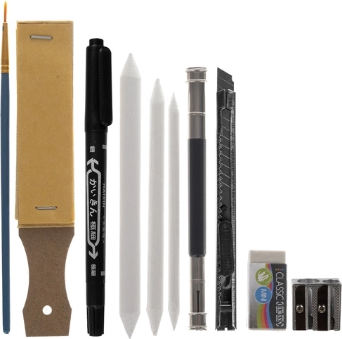 - 12 creioane cu cărbune (4× 2B, 4× 4B, 4× 6B)