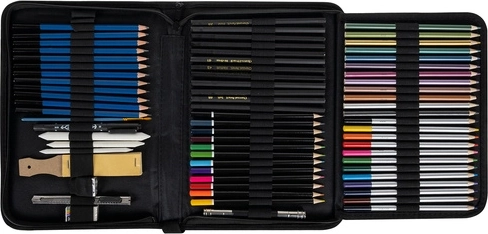 - 74 de piese pentru creație versatilă: durități de la H la B, cărbuni, creioane acvarelă și metalice, instrumente de blending și altele.