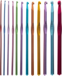 Setul conține 21 de croșete colorate de diferite dimensiuni cu un design ergonomic pentru o utilizare ușoară și confortabilă.