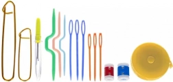 Setul include nu doar croșete, ci și foarfece, riglă și alte instrumente esențiale pentru croșetat.