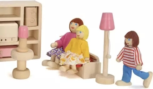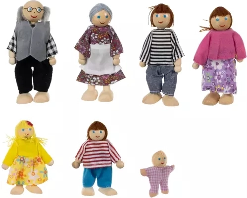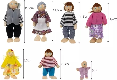 ELEMENTE MOBIL- personajele aupicioare și brațe mobile , care oferă jocului realism. Întregul set este realizat cu atenție la detalii. Păpușile din lemn se potrivesc căsuțelor pentru păpuși ale aproape tuturor producătorilor. Frumusețea clasică a lemnului și durabilitatea sa au fost întotdeauna apreciate.