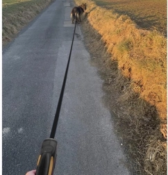 Banda textilă robustă și carabina cromată oferă rezistență ridicată și fixare ușoară la zgardă sau ham. Potrivită pentru câini de până la 50 kg.
