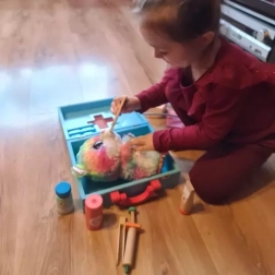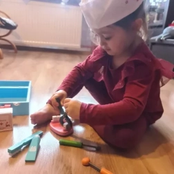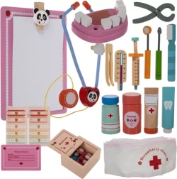 Acest set medical și stomatologic complex, într-o valiză solidă din lemn, oferă copiilor accesorii realiste pentru exersarea examinărilor și îngrijirii dinților. Datorită organizării practice și gamei largi de instrumente, copiii învață în mod natural să recunoască forme, culori și proceduri medicale prin joc.