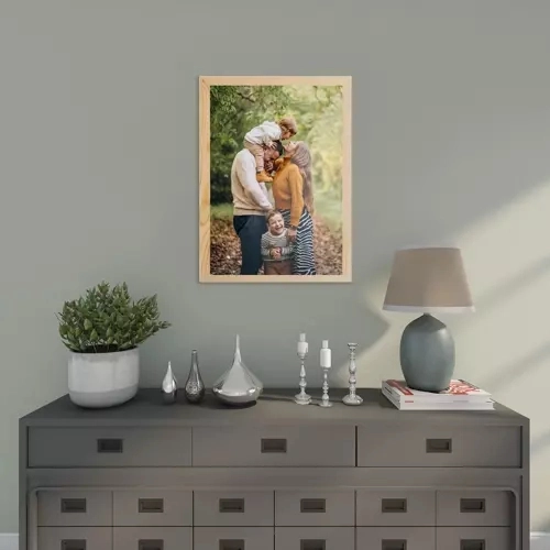 Rama din pin cu design stilat evidențiază fotografiile, posterele și mozaicurile. Partea frontală este protejată de plexiglas rezistent la impact, acoperit pe ambele fețe cu folie de protecție pentru transport în siguranță. Spatele este din placă HDF/MDF solidă, iar ansamblul are un aspect natural și atemporal.
