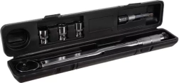 Cheie dinamometrică robustă 1/2" cu clichet și set de capete 17/19/21 mm și prelungitor, pentru strângerea și desfacerea precisă a îmbinărilor cu șuruburi. Oferă interval de cuplu 28–210 Nm, funcționare bidirecțională dreapta/stânga, blocare LOCK/UNLOCK și un toc de protecție practic pentru depozitare în siguranță. Ideală pentru șuruburi hexagonale și pătrate, cârlige și piulițe de motocicletă.