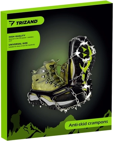 Tălpile antiderapante TRIZAND, mărimea XL (44–47), asigură un pas sigur pe zăpadă și gheață. Datorită țepilor din oțel și lanțurilor rezistente, oferă tracțiune excelentă, stabilitate și siguranță atât la drumeții de iarnă, cât și la mersul prin oraș. Mansonul elastic din TPE se montează rapid, stă ferm pe încălțăminte și nu deteriorează pantofii. Pachetul include un toc practic cu fermoar pentru transport ușor.