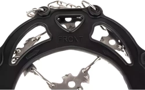 Opt țepi din oțel inoxidabil pe fiecare piesă, completați de lanțuri, asigură tracțiune maximă pe teren de iarnă și pe polei.