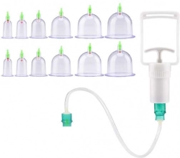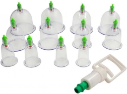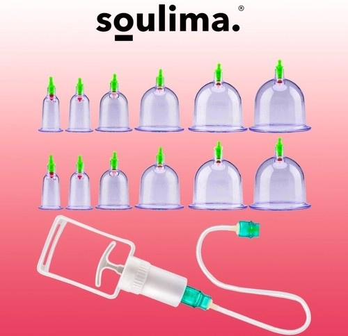 Setul conține 12 ventuze transparente din plastic cu supape și o pompă manuală de vid, care creează vacuum fără utilizarea focului. Ventuzele sunt reutilizabile, ușoare și ușor de curățat. Le poți folosi pentru masaje de relaxare, recuperare după sport și în ritualuri de wellness axate pe îmbunătățirea microcirculației și al calmării tensiunii musculare.