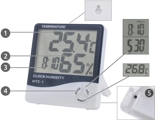 Această stație meteo digitală modernă HTC-1 combină măsurarea precisă a temperaturii interioare și a umidității relative cu afișarea orei. Ecranul LCD mare, cu contrast ridicat, asigură control imediat și lizibil al climatului din încăpere, contribuind la o mai bună aerisire, confort și grijă pentru sănătate și locuință.
