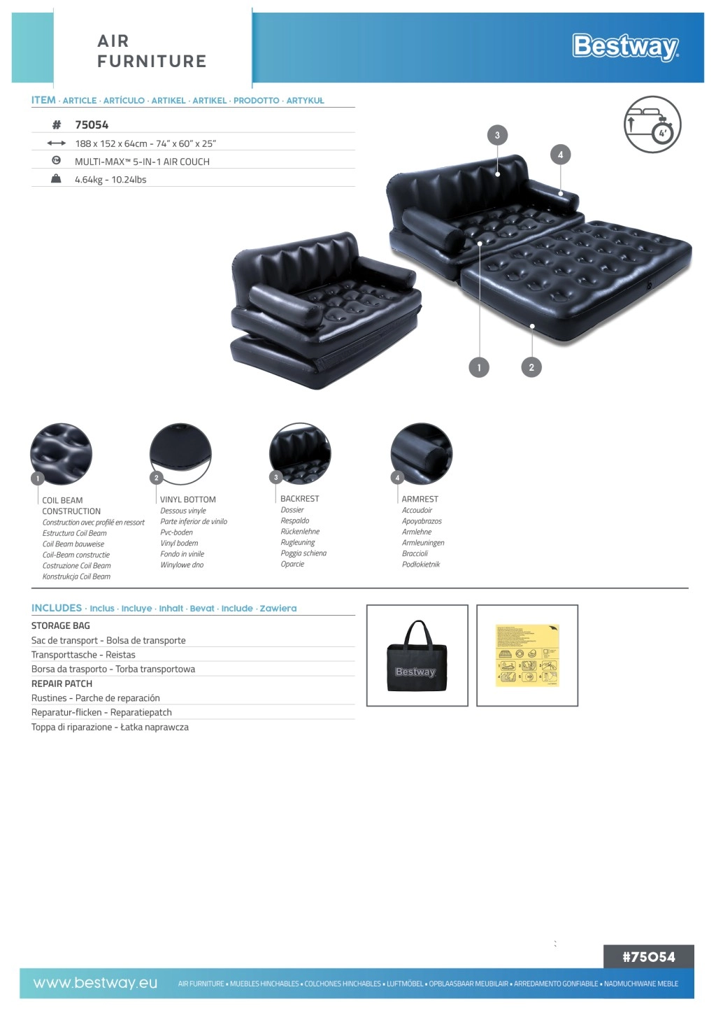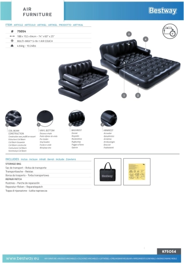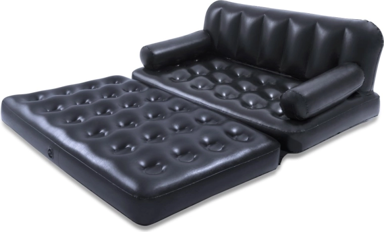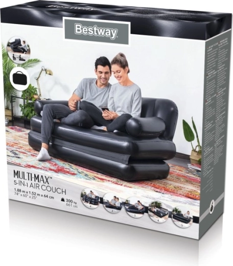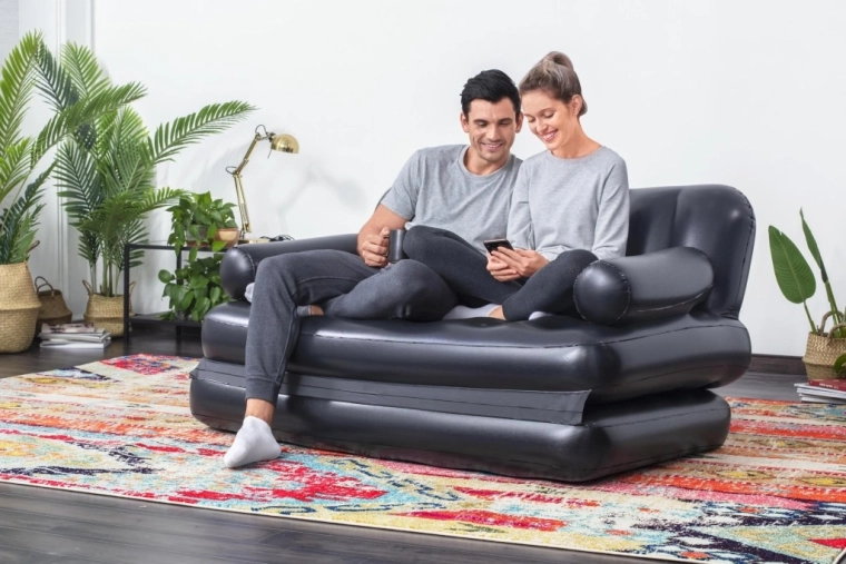 Canapeaua gonflabilă universală BESTWAY 5 în 1 combină șederea confortabilă și somnul pentru două persoane. Oferă funcții de canapea, șezlong și pat matrimonial cu strat dublu. PVC rezistent, structură Coil Beam stabilă și supapă de eliberare rapidă asigură utilizare ușoară, confort și durabilitate la interior.
