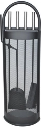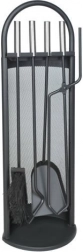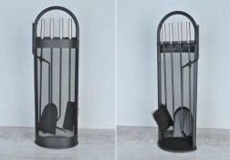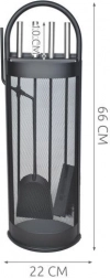 Totul la îndemână: clește, lopățică, perie, cârlig/poker și suport stabil pentru depozitare ordonată și acces rapid în timpul utilizării șemineului.