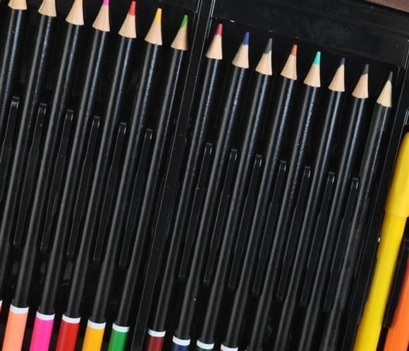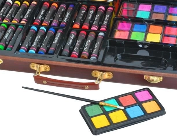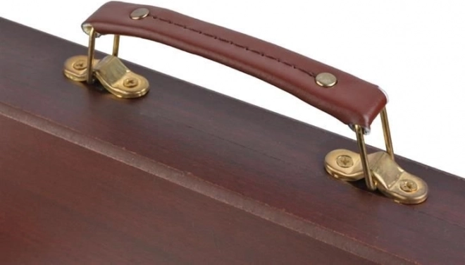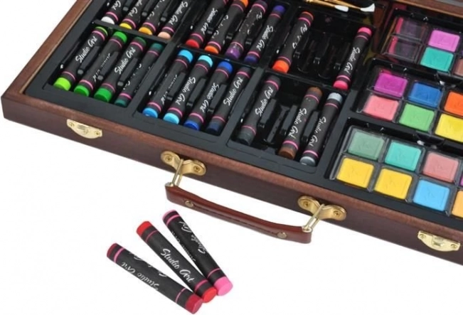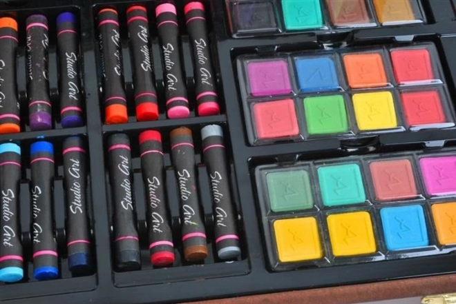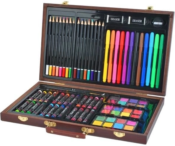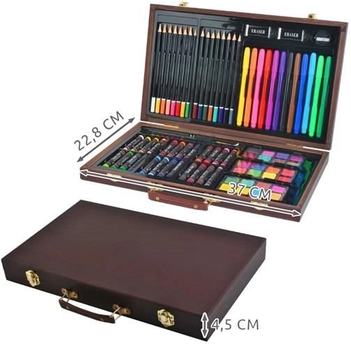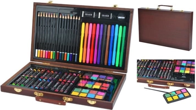 Această trusă de artă universală oferă tot ce aveți nevoie pentru a vă dezvolta creativitatea – de la schiță până la pictură în acuarelă. Totul este depozitat într-o servietă rezistentă din lemn, cu închizători metalice sigure și un mâner din piele, confortabil, pentru transport facil. Datorită compartimentelor separate, aveți fiecare instrument la îndemână și perfect organizat.