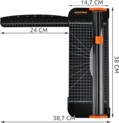 Acest trimmer pentru hârtie realizează tăieturi precise, drepte sau oblice, până la formatul A3. Scala clară în centimetri și inci, împreună cu grila marcată și raportorul, permit alinierea rapidă și sigură a documentelor, fotografiilor sau materialelor promoționale.