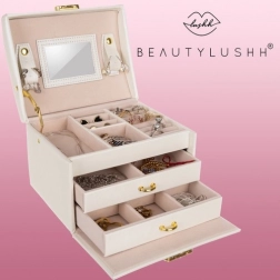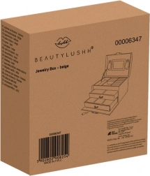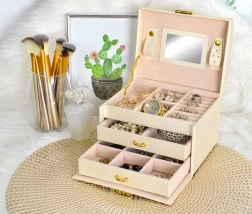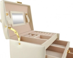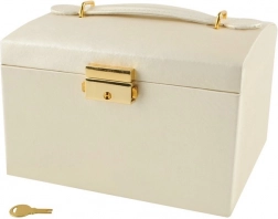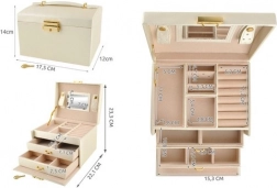 Cutia de bijuterii elegantă, în culoare bej, cu finisaj satinat, oferă până la 20 de compartimente, 2 sertare și role pentru inele practice. În interiorul capacului se află o oglindă și benzi cu închidere pentru lanțuri sau brățări. Datorită închiderii cu cheie, bijuteriile tale sunt în siguranță, iar tapițeria fină protejează împotriva zgârieturilor. Detaliile aurii subliniază eleganța atemporală, iar cutia este perfectă atât pentru acasă, cât și pentru călătorii.