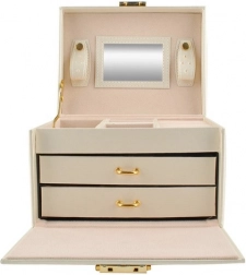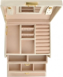 Această cutie de bijuterii stilată îți păstrează colecția organizată și protejată. Compartimentele de dimensiuni diferite sunt ideale pentru inele, cercei, brățări, lanțuri și ceasuri, iar cele două sertare separate oferă spațiu pentru alte accesorii. Căptușeala moale îngrijește delicat suprafețele sensibile și previne uzura.
