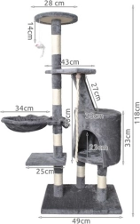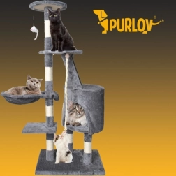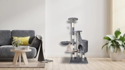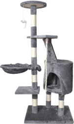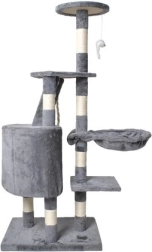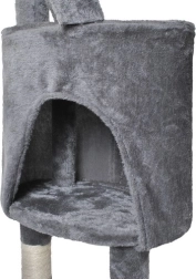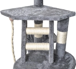 Oferă mai multe nivele pentru pisici, inclusiv o căsuță confortabilă, trepte și o jucărie suspendată care stimulează curiozitatea pisicii.