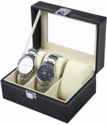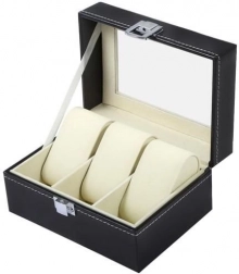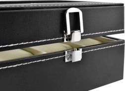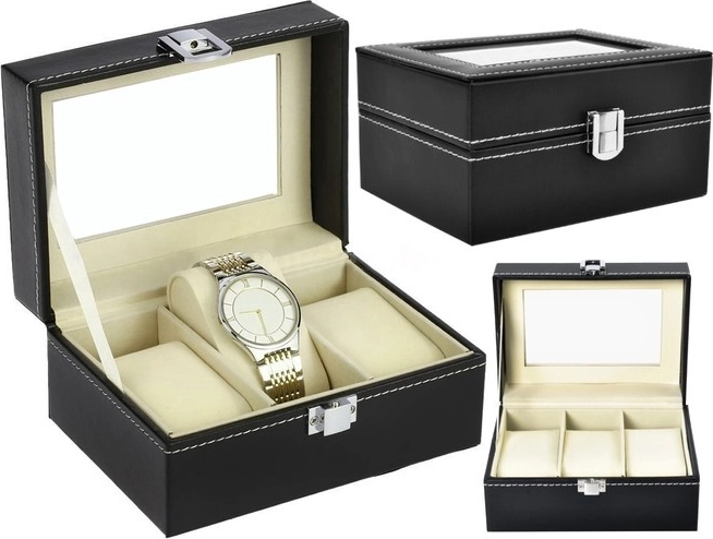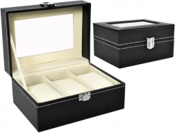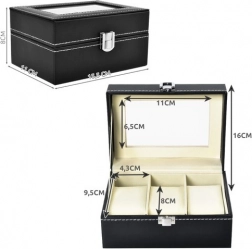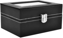 Organizează și protejează-ți ceasurile și bijuteriile într-o cutie elegantă ce combină un aspect premium cu protecție practică. Pielea ecologică neagră cu cusătură albă contrastantă are un aer atemporal, iar capacul din sticlă oferă vizibilitate instantanee și expunere atractivă a conținutului.