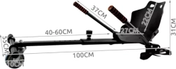 Cadrul robust din metal și materiale rezistente este conceput pentru siguranță și durată de viață îndelungată. Reglarea lină a lungimii 40–60 cm permite adaptarea precisă la statura utilizatorului, în timp ce rotița frontală pivotantă asigură manevrabilitate cursivă. Montajul este rapid și fără unelte – cu ajutorul clemelor rezistente și chingilor reglabile cu arici fixezi ușor atașamentul pe diferite tipuri de hoverboarduri.
