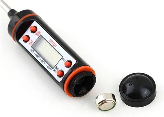 Practic termometru de bucătărie digital cu afișaj LCD și sondă din oțel inoxidabil pentru măsurarea rapidă și precisă a temperaturii cărnii, lichidelor, uleiurilor și vinului. Oferă interval -50 până la +300 °C, precizie 1 °C, funcția HOLD, memoria ultimei măsurători și oprire automată. Afișaj °C/°F ușor de citit, alimentare cu baterie LR44 (inclusă în pachet).