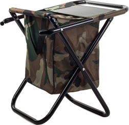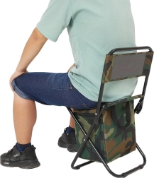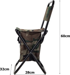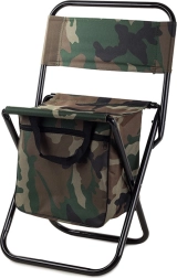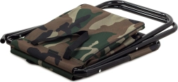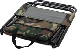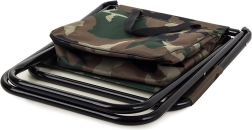 Scaun turistic ușor și compact, în stil camuflaj MORO, cu spătar practic și geantă integrată sub șezut. Oferă ședere confortabilă la pescuit, camping sau festival, cadru stabil din oțel și transport facil datorită mânerului și bretelelor.