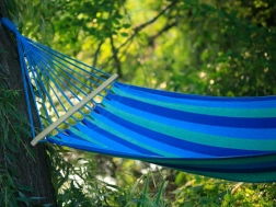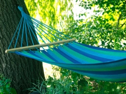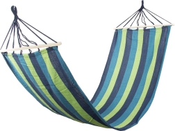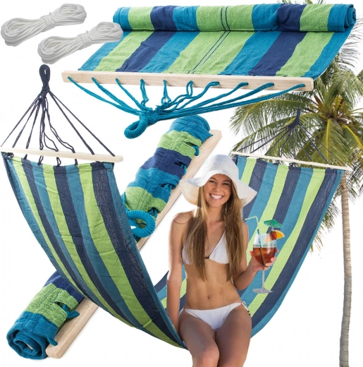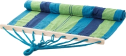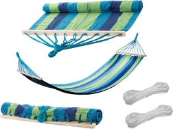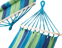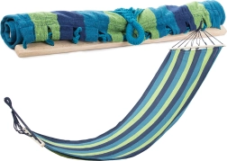 Acest hamac de grădină cu bare de întindere din lemn este ideal pentru relaxare atât în exterior, cât și în interior. Amestecul rezistent de bumbac și poliester este plăcut la atingere, respirabil și totodată durabil. Datorită frânghiilor groase împletite și construcției stabile, vă veți bucura de legănare în siguranță și confort.