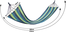 Pachetul include șnururi de prindere, astfel încât instalarea este rapidă – între copaci, pe un suport sau pe console speciale. Hamacul se transportă ușor, ocupă puțin spațiu și poate fi spălat la mașină, fiind perfect pentru grădină, terasă, balcon și camping.