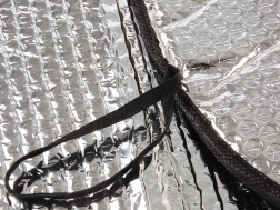Suprafața metalizată cu izolație cu bule reflectă razele soarelui, reduce temperatura în cabină și protejează bordul și tapițeria împotriva decolorării.