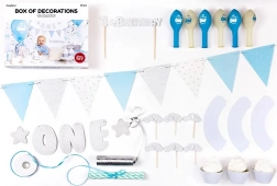 În pachet găsești decorațiuni pentru masă și pentru încăpere, care se potrivesc perfect între ele. Datorită topperului și decorațiunilor pentru brioșe vei pune la punct colțul dulce, iar baloanele și ghirlandele vor accentua caracterul festiv al încăperii.