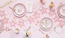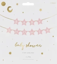Adaugă farmec decorului baby shower cu bannerul de hârtie cu steluțe și inscripția Baby Shower. Varianta în roz deschis este ideală pentru un decor delicat, elegant și fotogenic.