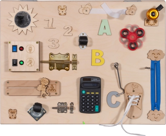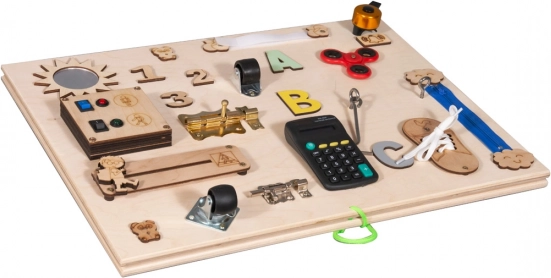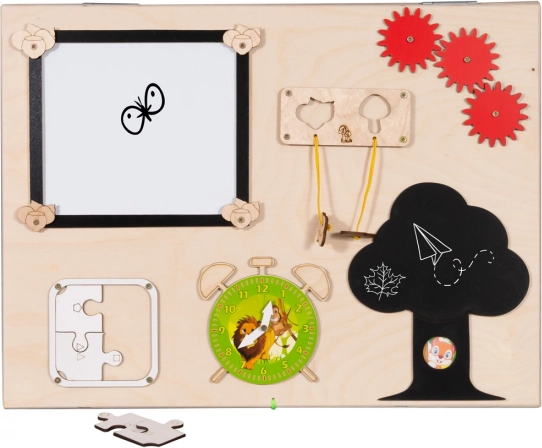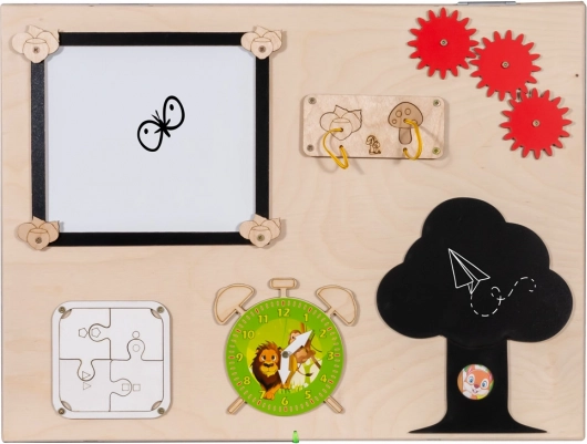 Această placă de lemn manipulativă este plină de diverse elemente de joc care ajută copiii să-și dezvolte abilitățile. Copiii se pot juca cu diverse mecanisme interactive care garantează distracția pentru ore îndelungate.