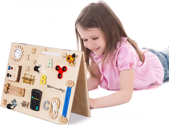 Elementele interactive nu doar că stimulează îndemânarea, dar și capacitatea de gândire logică a copilului dvs. Construcția pe două fețe permite flexibilitate în amplasarea pe masă sau podea și producția din lemn garantează longevitate.