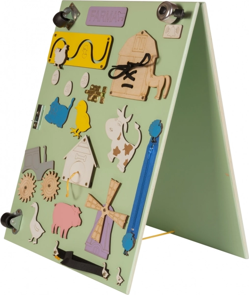 Tabla din lemn, dublă față cu motiv de fermă va capta atenția copilului dvs. nu numai prin culori, ci și prin activitățile diversificate. Tabla conține imagini ale diferitelor animale, cum ar fi vacă, găină sau cal, și, de asemenea, permite interacțiunea cu elemente mobile, precum roți dințate rotative, fermă și uși cu lacăt. Copilul dvs. poate învăța să lege șireturi, să deschidă și să închidă zăvoare și să miște diferite elemente.