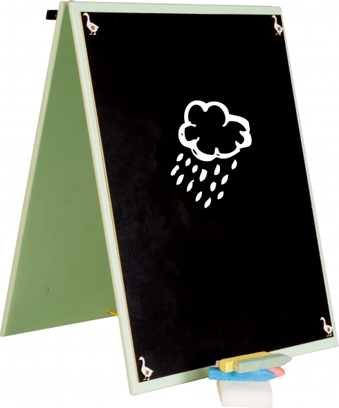 Pe cealaltă parte, tabla este echipată cu o suprafață de scris cu cretă. Setul include cretă și burete. Tabla este realizată din lemn de calitate, fiind o alternativă ecologică la jucăriile din plastic și oferă o durabilitate mai mare.