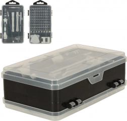 Carcasa transparentă și robustă, cu locașuri inscripționate, păstrează toți biții și uneltele ordonate și mereu la îndemână – ideală pentru călătorii și atelier.