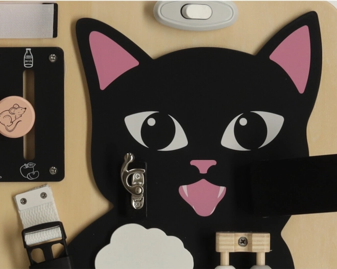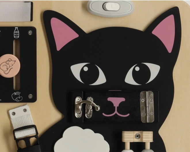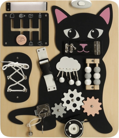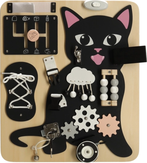 Combinatia unui pisoi negru cu detalii din lemn deschis atrage atenția și păstrează copilul implicat ore întregi.