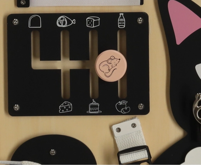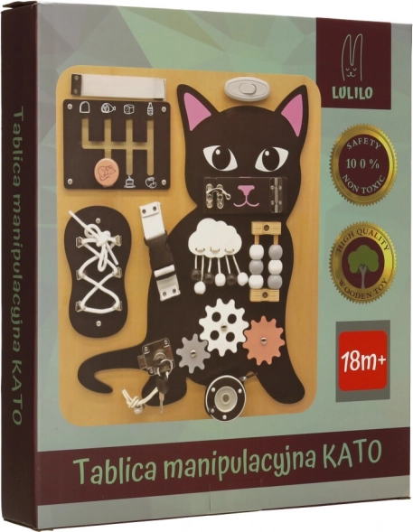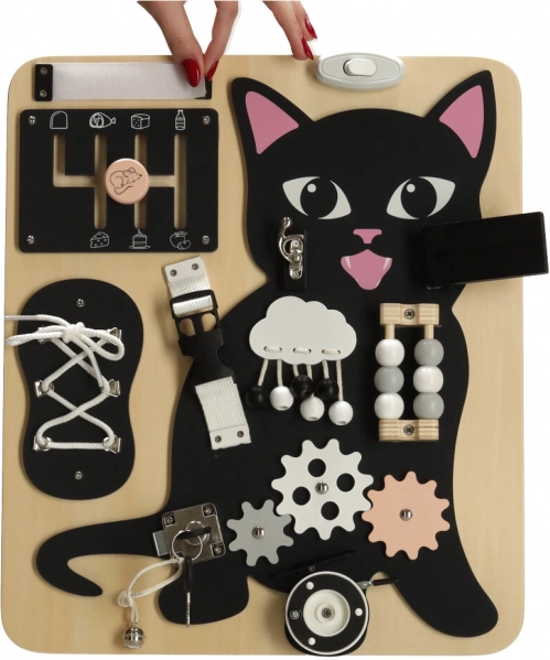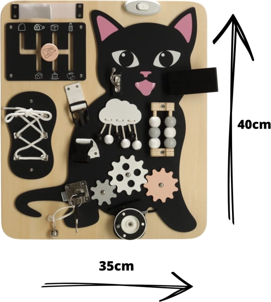 Tablă Lulilo în formă de pisică este o jucărie educativă preferată de copii, care îi îndeamnă să rotească, să tragă, să lege și să mute. Îi ajută să dezvolte motricitatea fină, precizia mișcărilor și forța mâinilor. Puzzle-urile și sarcinile distractive stimulează abilitățile cognitive ale copiilor și le aduc satisfacție prin reușite.