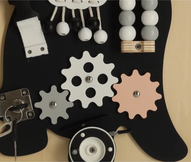 Prin elemente interactive precum angrenaje, încuietori și șireturi, copiii învață motricitatea fină și își îmbunătățesc precizia mișcărilor mâinilor.