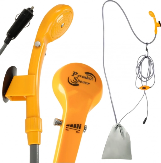 Bucură-te de un duș răcoritor oriunde – acest duș portabil de camping la 12 V cu pompă submersibilă aduce confortul de acasă în natură. Oferă reglare lină a debitului, întrerupător in-line, suport cu ventuză și cârlig pentru agățare. Ușor, compact și ideal pentru camping, grădină, spălarea bicicletelor sau a animalelor de companie.