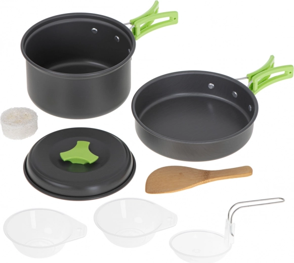 În set veți găsi o tigaie, o oală și capac, care sunt fabricate din aluminiu pentru gătire rapidă și eficientă. Două boluri pentru împărțirea mâncării, spatula de lemn pentru amestecare și polonicul fac pregătirea mâncărurilor calde simplă și convenabilă.