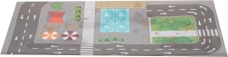 Pachetul include un covoraș cu imprimeu de străzi, care extinde spațiul de joacă și facilitează construirea propriului oraș în jurul parcării.