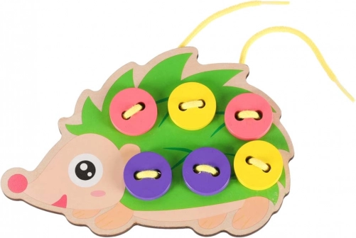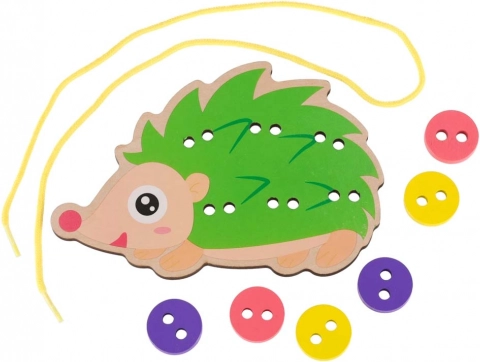 Acest arici pentru înșirat este un instrument ideal pentru primii pași în legare și „cusut”. Copiii trec șnurul prin orificii și fixează nasturii colorați pe „țepii” ariciului. Culorile vii și vesele îi atrag natural spre joc și îi ajută să deosebească nuanțe și forme.