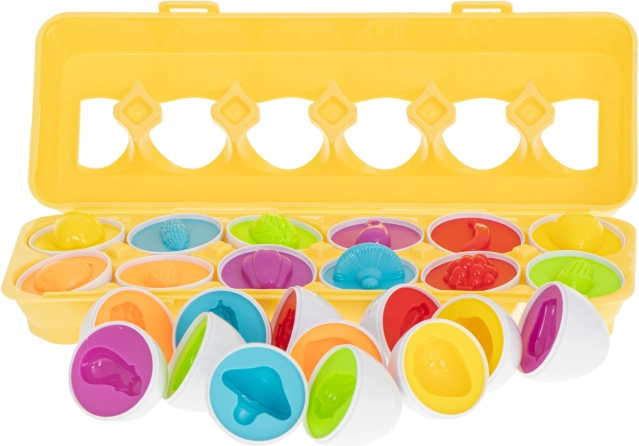 Jocul cere ca copiii să potrivească jumătățile de ouă cu forma și culoarea corectă, sprijinind gândirea logică.