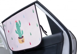 Protecție practică și sigură pentru călătorii cu copii sau adulți. Țesătura din poliester în două straturi, cu imprimeu cactuși, asigură întunecare totală, atenuează lumina orbitoare și previne supraîncălzirea mașinii. Pe verso se află inscripția „Go out and enjoy the sunshine” pe fundal negru.